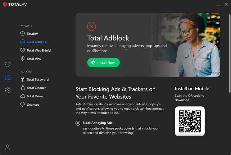 As part of the TotalAV security suite, it bundles free antivirus software and an ad-blocker.
