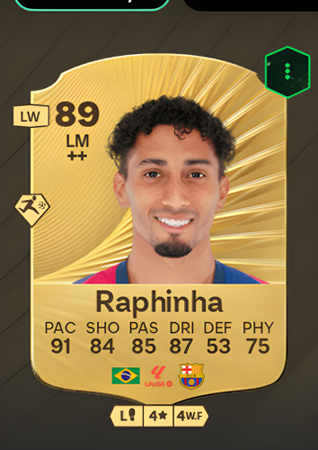 Raphael Dias Belloli's Gold Rare card stands out as a dynamic Left Midfielder with an impressive overall rating of 89, boasting remarkable attributes such as 91 pace, 84 shooting, 85 passing, and 87 dribbling. These qualities make him an exceptional asset on the wing, where his speed and technical skill allow him to swiftly break through defenses and create scoring opportunities. With his sharp attacking prowess, this card is ideal for players looking to capitalize on quick counterattacks and decisive plays that can turn the tide of any match.