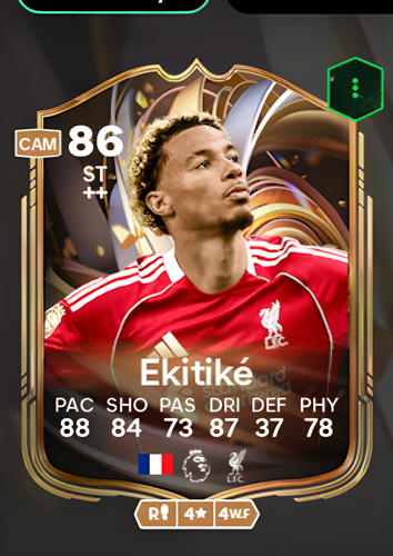 Hugo Ekitiké’s Ratings Reload card brings an exciting option to the striker position, boasting an impressive overall rating of 86. With standout attributes such as 88 pace and 87 dribbling, Ekitiké is equipped to burst past defenders and create scoring opportunities with ease. His shooting rating of 84 ensures he’s a reliable finisher in front of goal, while 78 physicality allows him to hold his own in tight situations. Although his passing and defense are less prominent at 73 and 37 respectively, this card is perfectly tailored for players seeking a sharp attacking threat who can quickly break down opposition defenses and capitalize on chances to secure victory.
