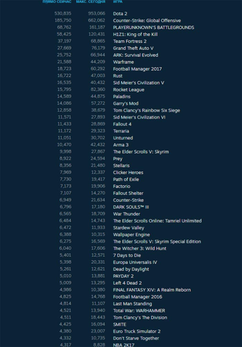 На втором месте расположилась приключенческая игра Prey, которая продолжает удерживать свои позиции. Третью строчку занимает популярный тактический шутер Counter-Strike: Global Offensive, подтверждая свою популярность среди геймеров.